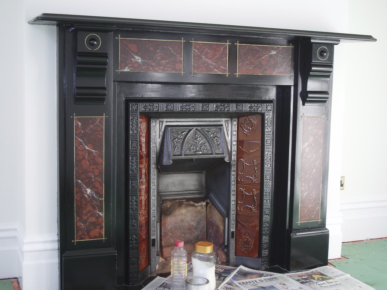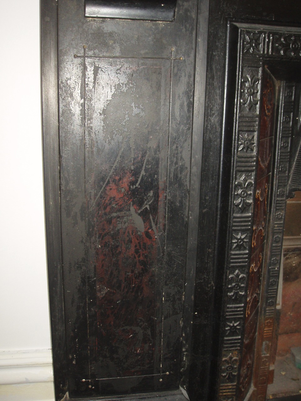This carved slate Victorian fireplace in a private home in London had an original faux marble finish that was badly damaged. As there was not much of the original decoration remaining to use as an example, I researched different finishes used on similar fireplaces of the same era. Together with the client, I created a composition that would suit their new interior while keeping most of the original design.