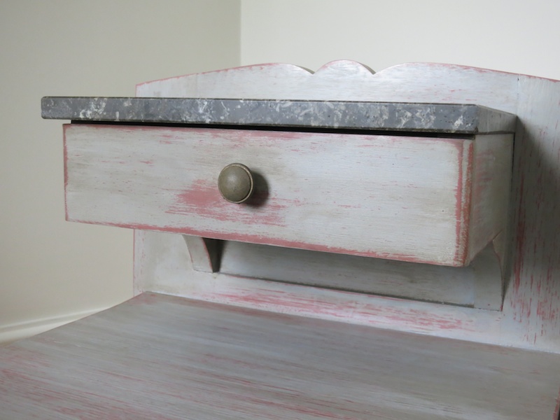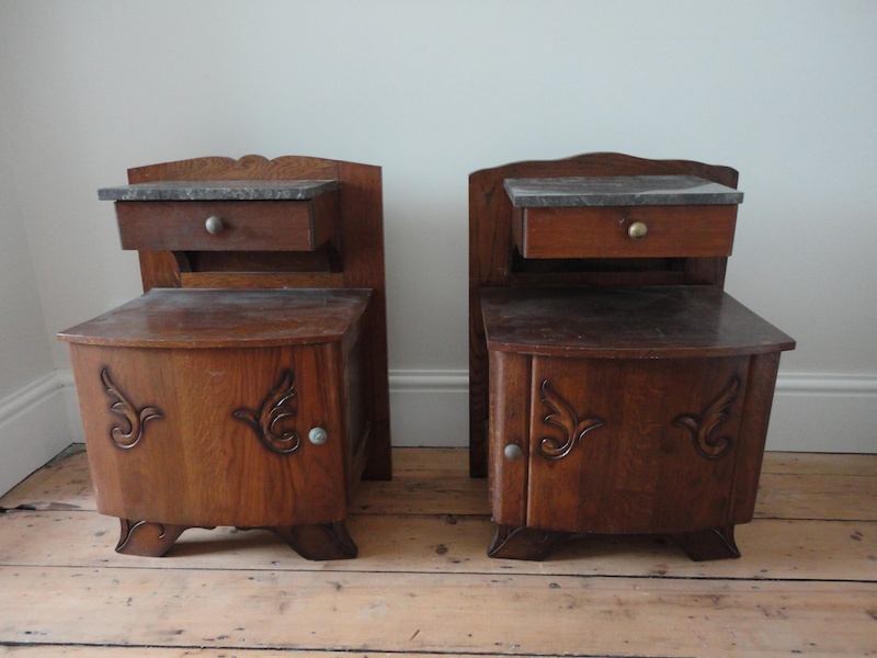 The following images are of a pair of oak bedside tables I transformed. I used Annie Sloan paints after removing the varnish and sanding them down. The first coat is Scandinavian Pink and the second Graphite mixed with Original. Once these two coats had been left to dry, I then sanded the tables with a medium sandpaper making the first coat come through. A mixture of Dark and Transparent wax was then applied to give them a natural patina. Shabby chic is about creating an illusion.