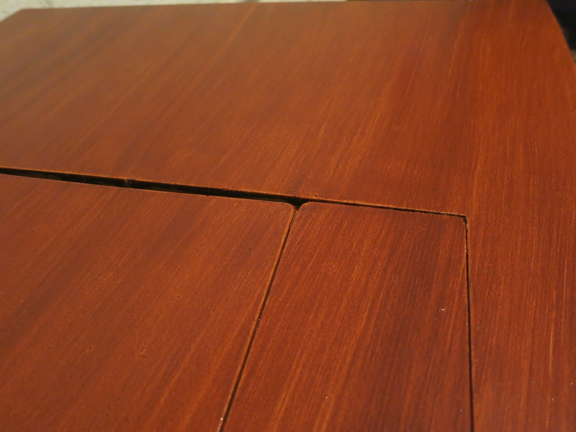 I am very fond of traditional painting methods. For this table I am using oil paints with a tupentine and linseed oil glaze. The faux mahogany was painted in two stages. Stage 1: an oil glaze of burnt sienna, burnt umber and carmine red. Stage 2: a beer glaze of cassel earth pigment to create the pores of the wood.