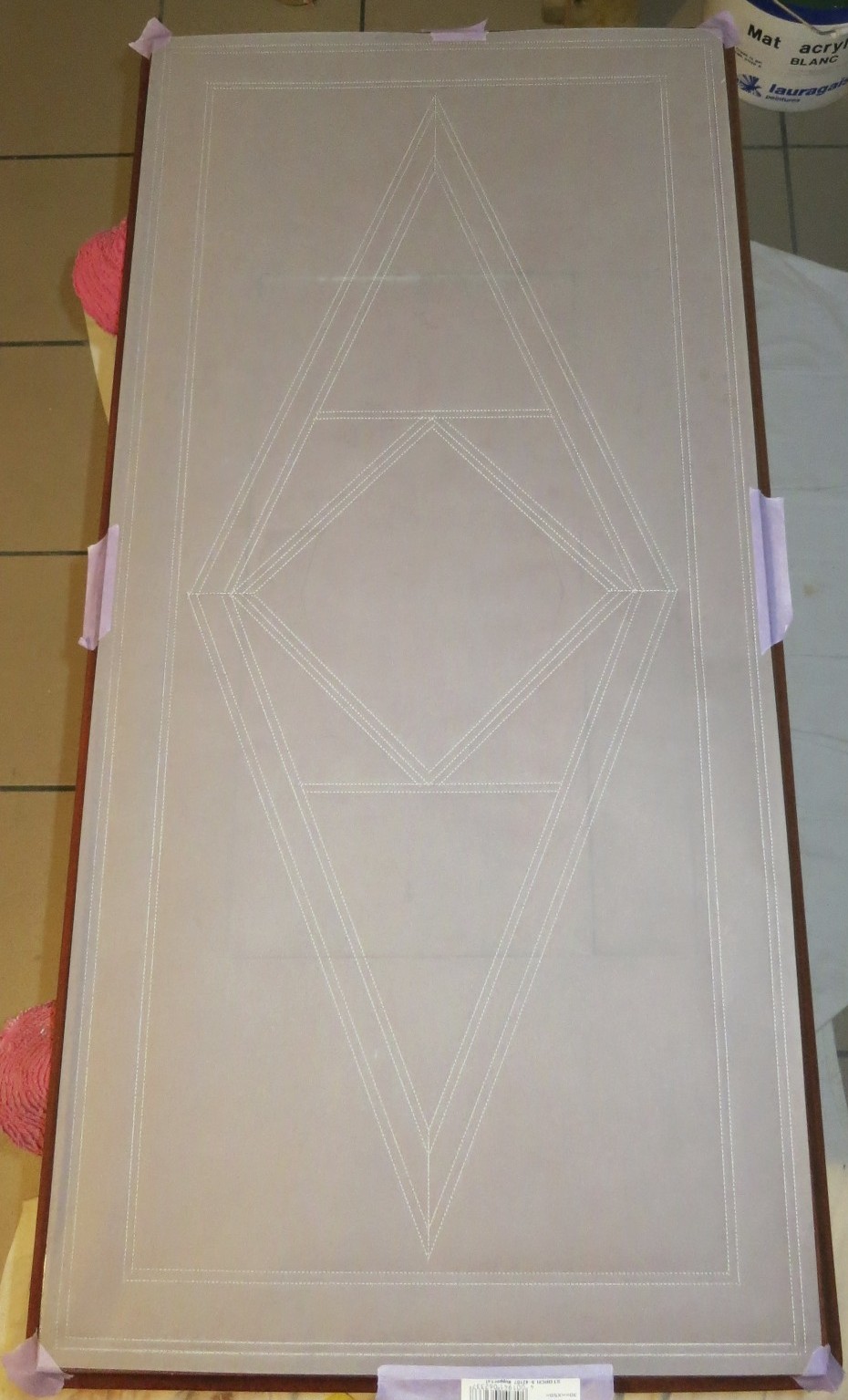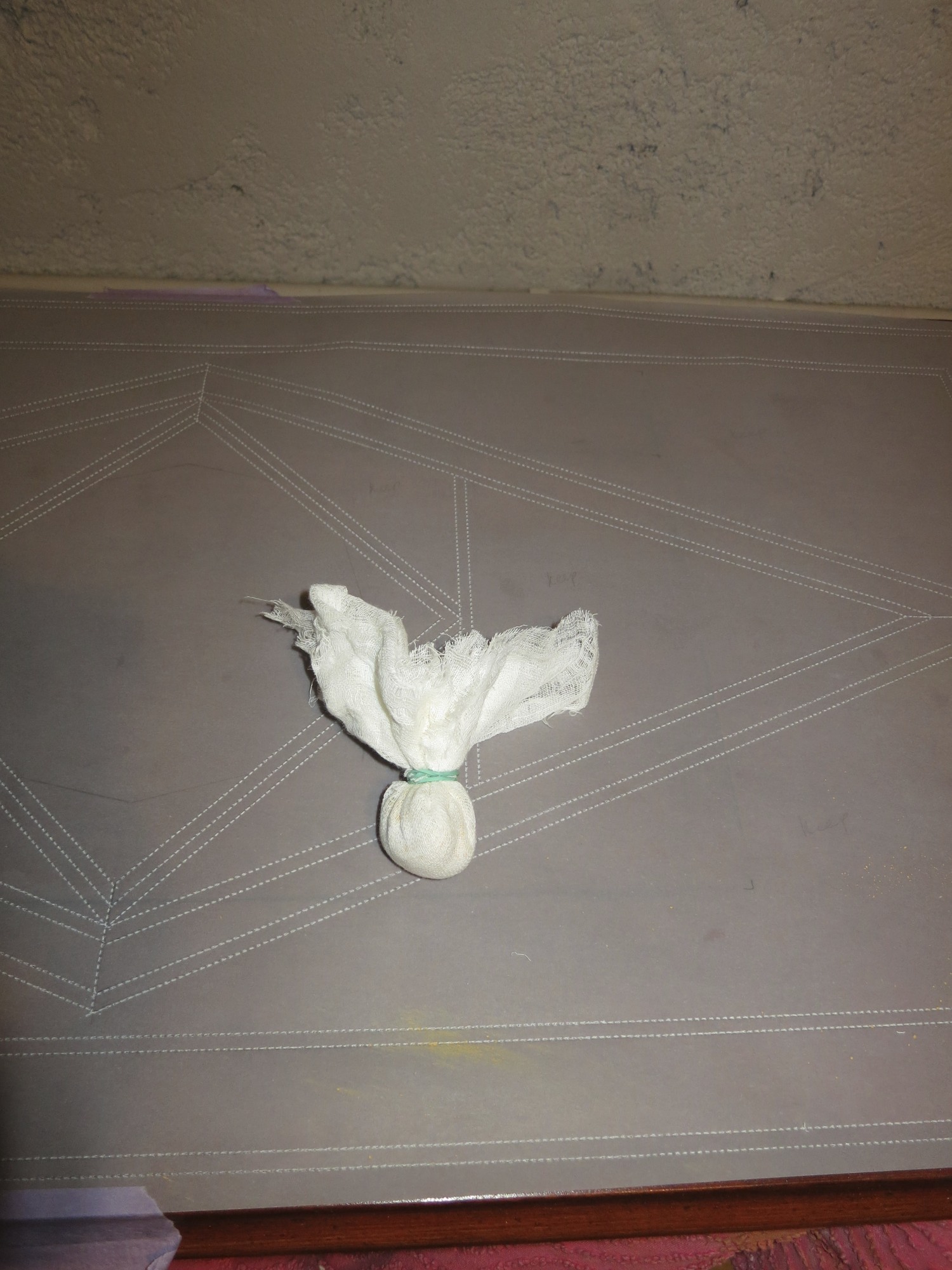 I learnt a useful way of transferring patterns on to different surfaces accurately at the Van der Kelen Institute. The technique is Pouncing. I used it here to put my hand-drawn marquetry design on to the faux mahogany table top.