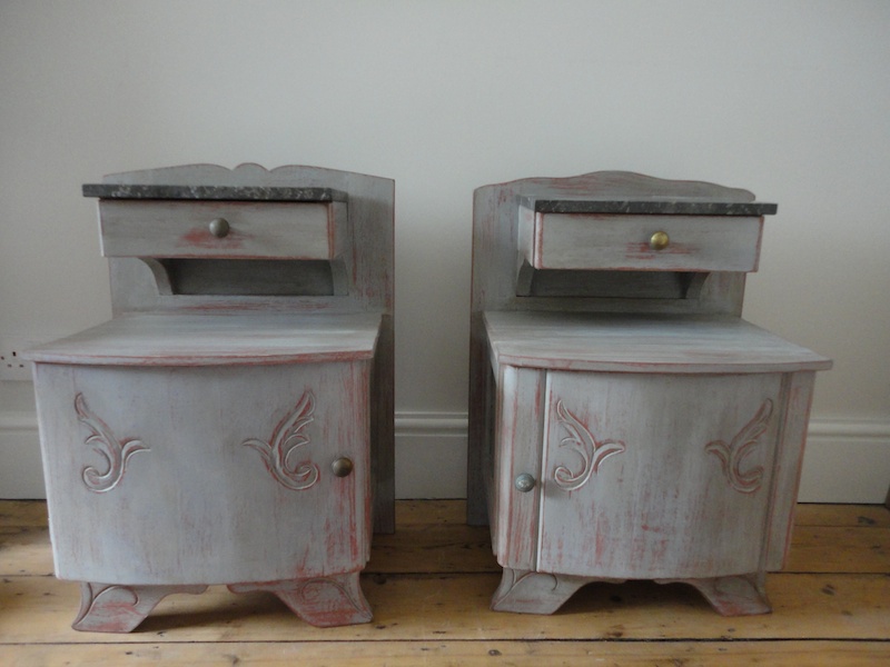 These beautiful solid oak bedside tables were looking rather dreary. The dark varnish made them appear dated, and therefore difficult to incorporate into a modern bedroom. I removed the old varnish and applied Annie Sloan chalk paints to give them a new life.