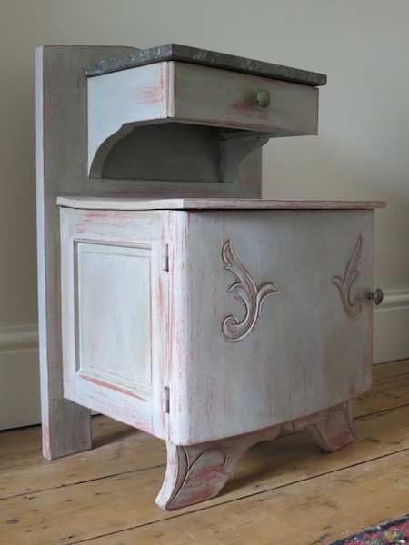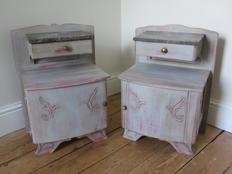 The following images are of a pair of oak bedside tables I transformed. I used Annie Sloan paints after removing the varnish and sanding them down. The first coat is Scandinavian Pink and the second Graphite mixed with Original. Once these two coats had been left to dry, I then sanded the tables with a medium sandpaper making the first coat come through. A mixture of Dark and Transparent wax was then applied to give them a natural patina. Shabby chic is about creating an illusion.