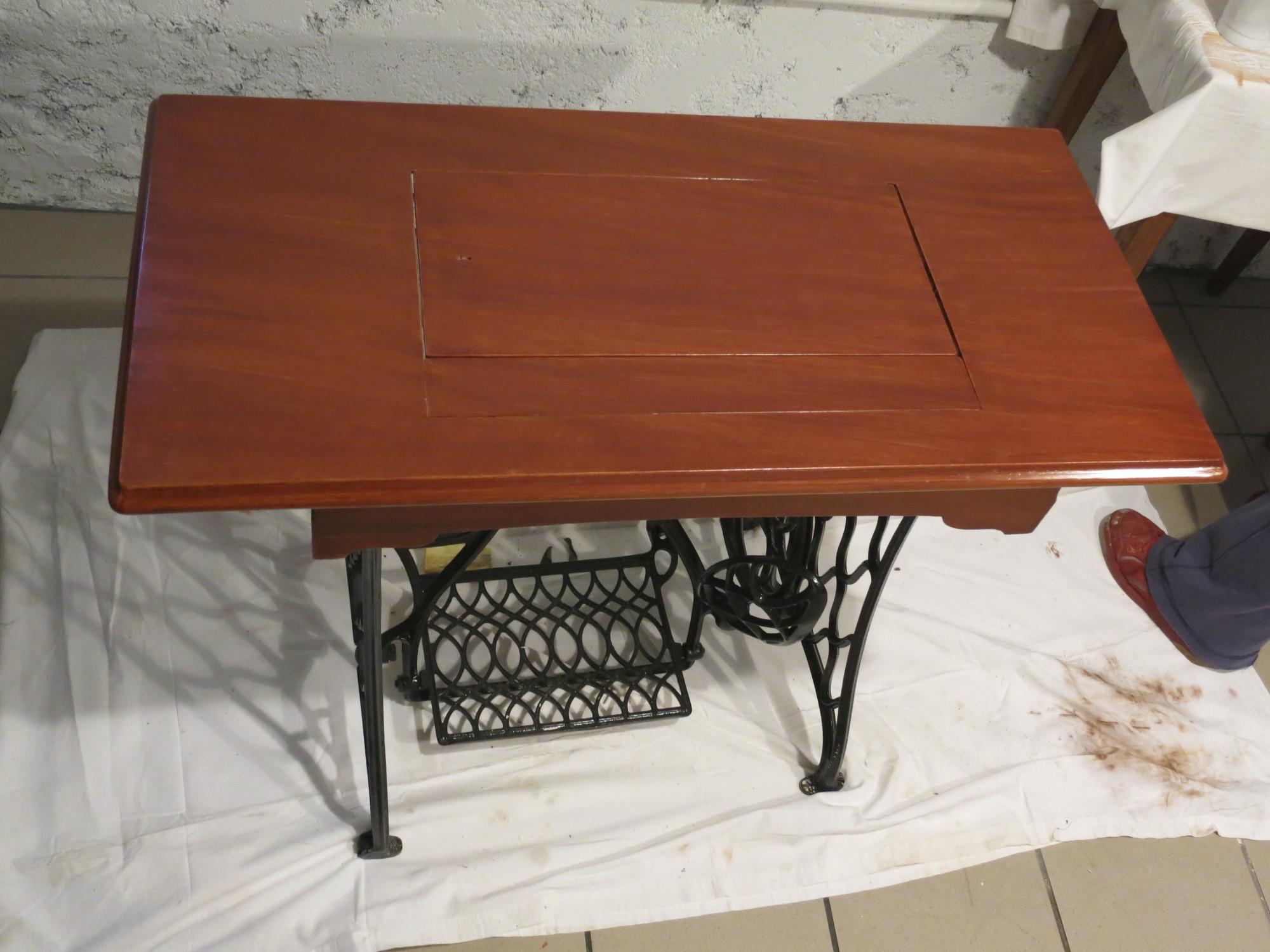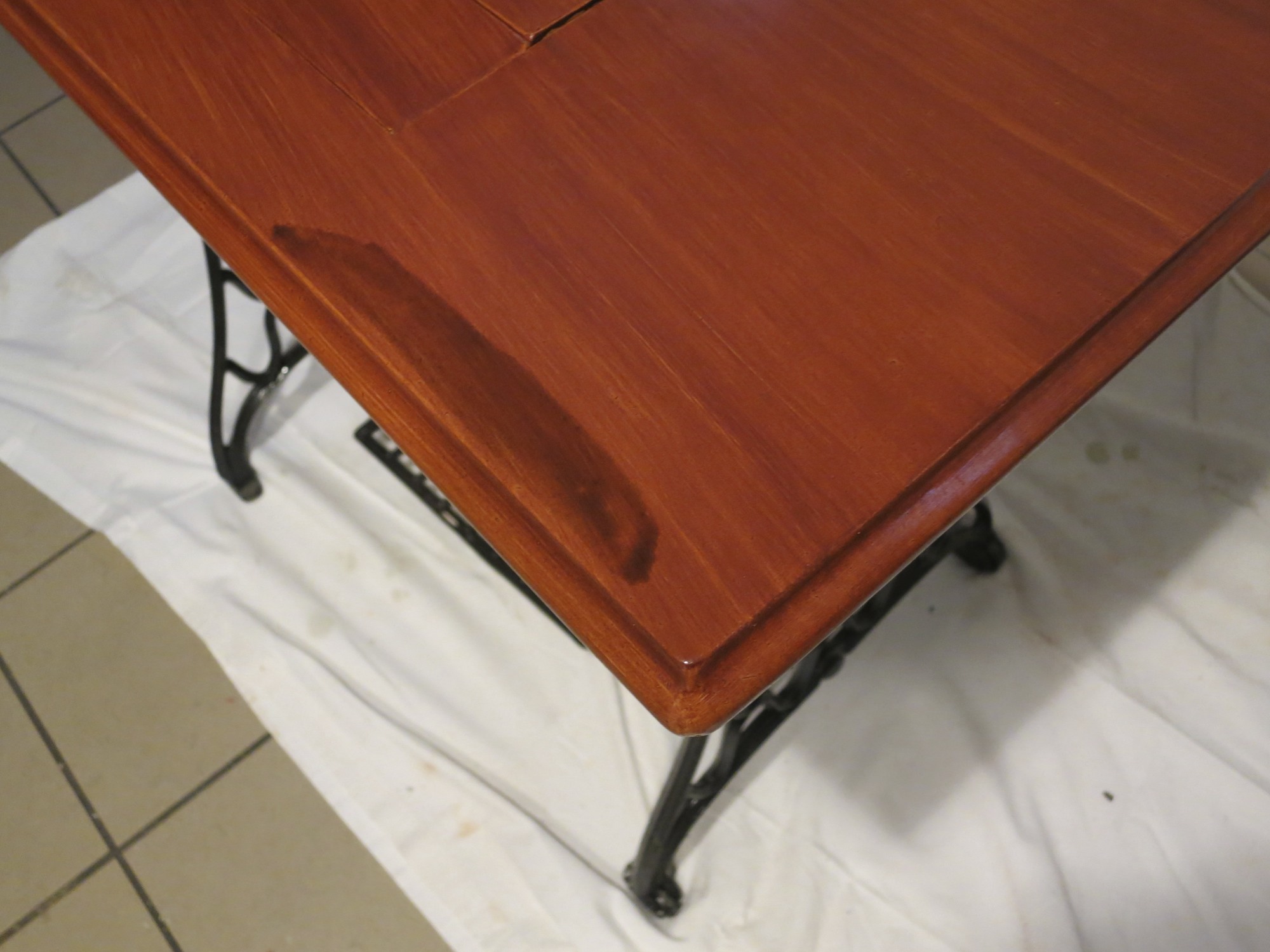 I am very fond of traditional painting methods. For this table I am using oil paints with a tupentine and linseed oil glaze. The faux mahogany was painted in two stages. Stage 1: an oil glaze of burnt sienna, burnt umber and carmine red. Stage 2: a beer glaze of cassel earth pigment to create the pores of the wood.